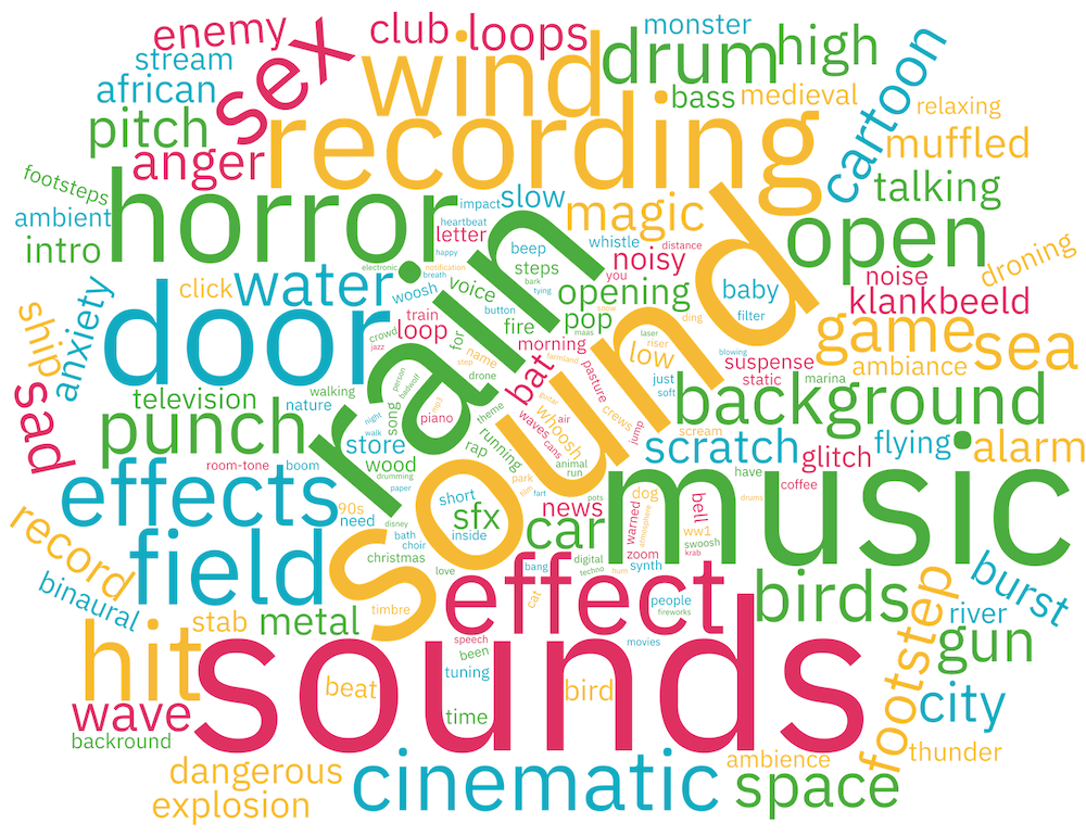 Let’s continue with the term cloud, which shows the most common query terms that have been used when searching in Freesound during 2025: