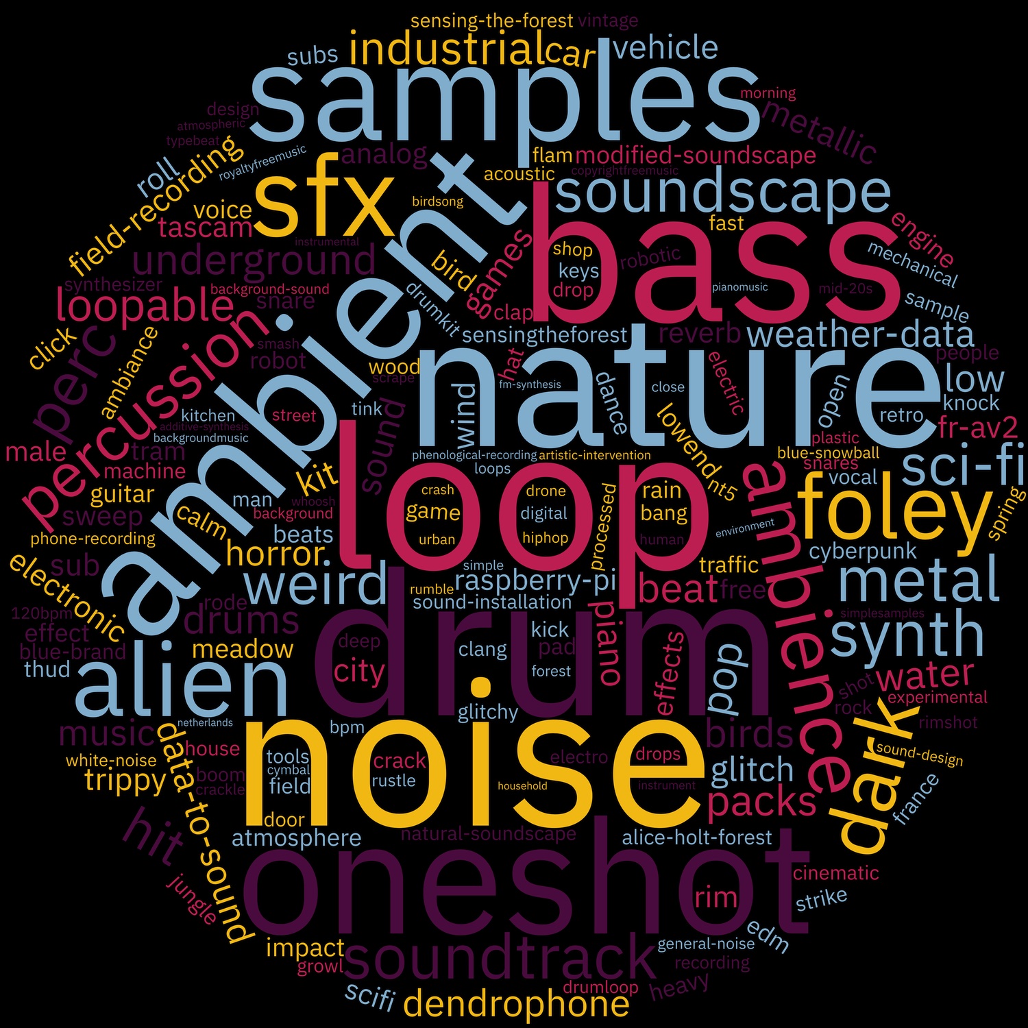 Here is a tag cloud of the tags of the sounds uploaded during 2025: