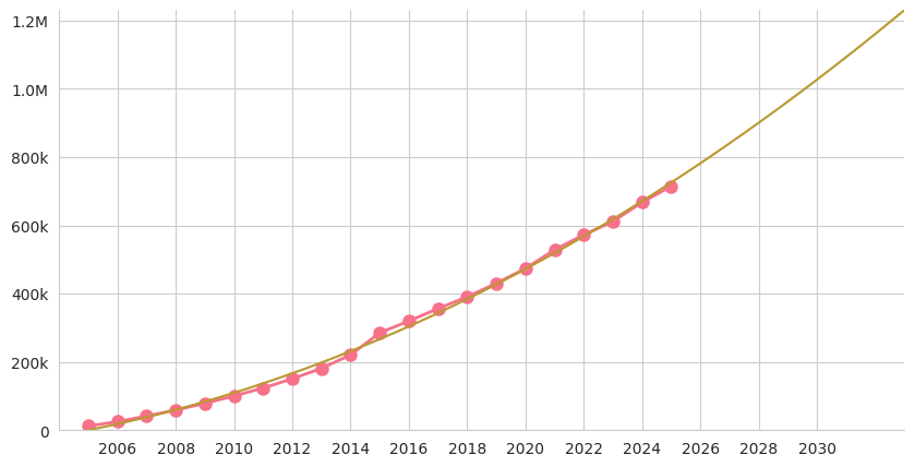 With the new additions from 2025, Freesound now currently hosts a stunning total of 714,671 sounds (YES, we surpassed the 700k mark!). The total audio duration is of 536 days and 8 hours. Here is the evolution of the total number of sounds since the beginning of Freesound, and the prediction for the future: