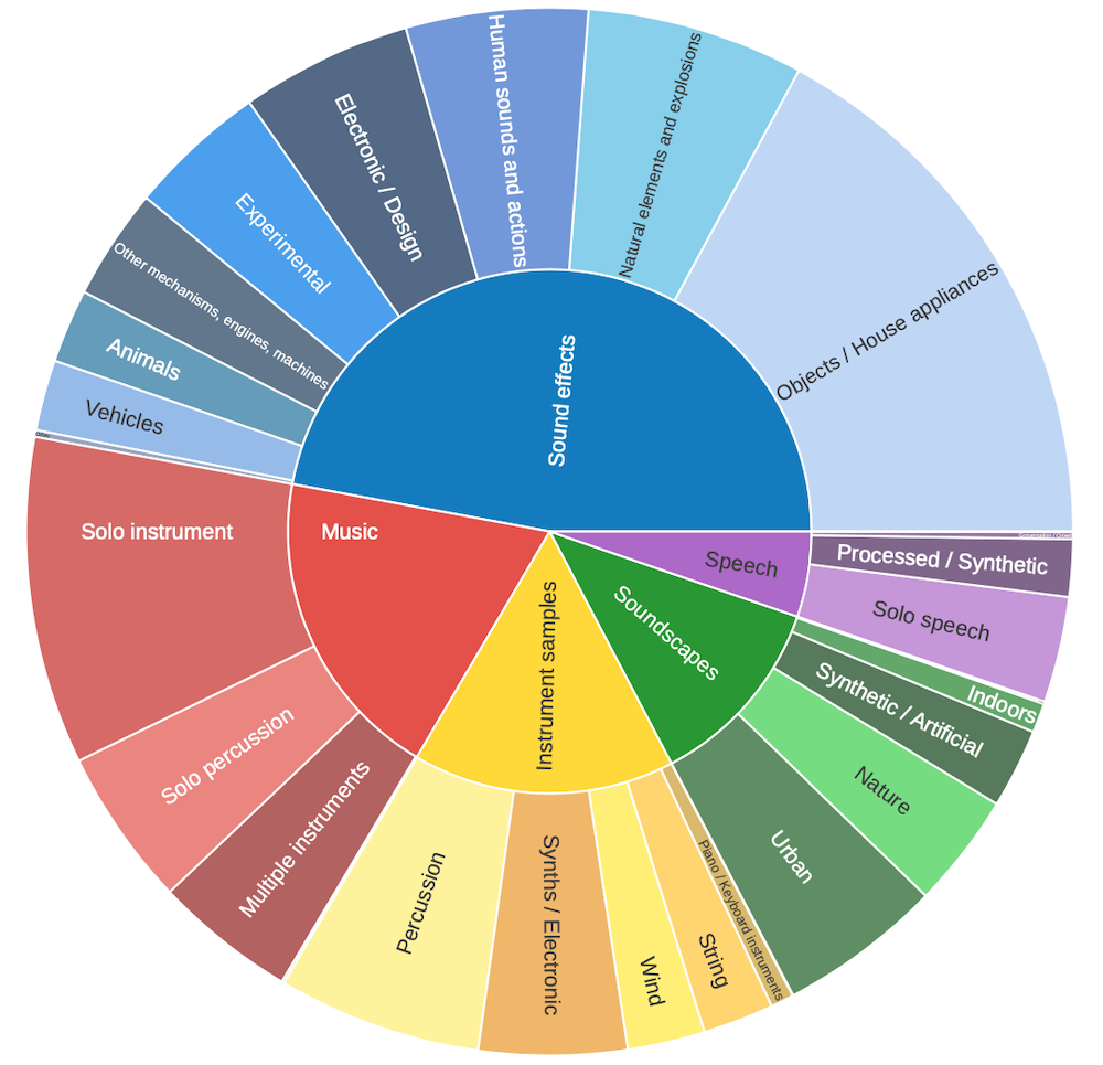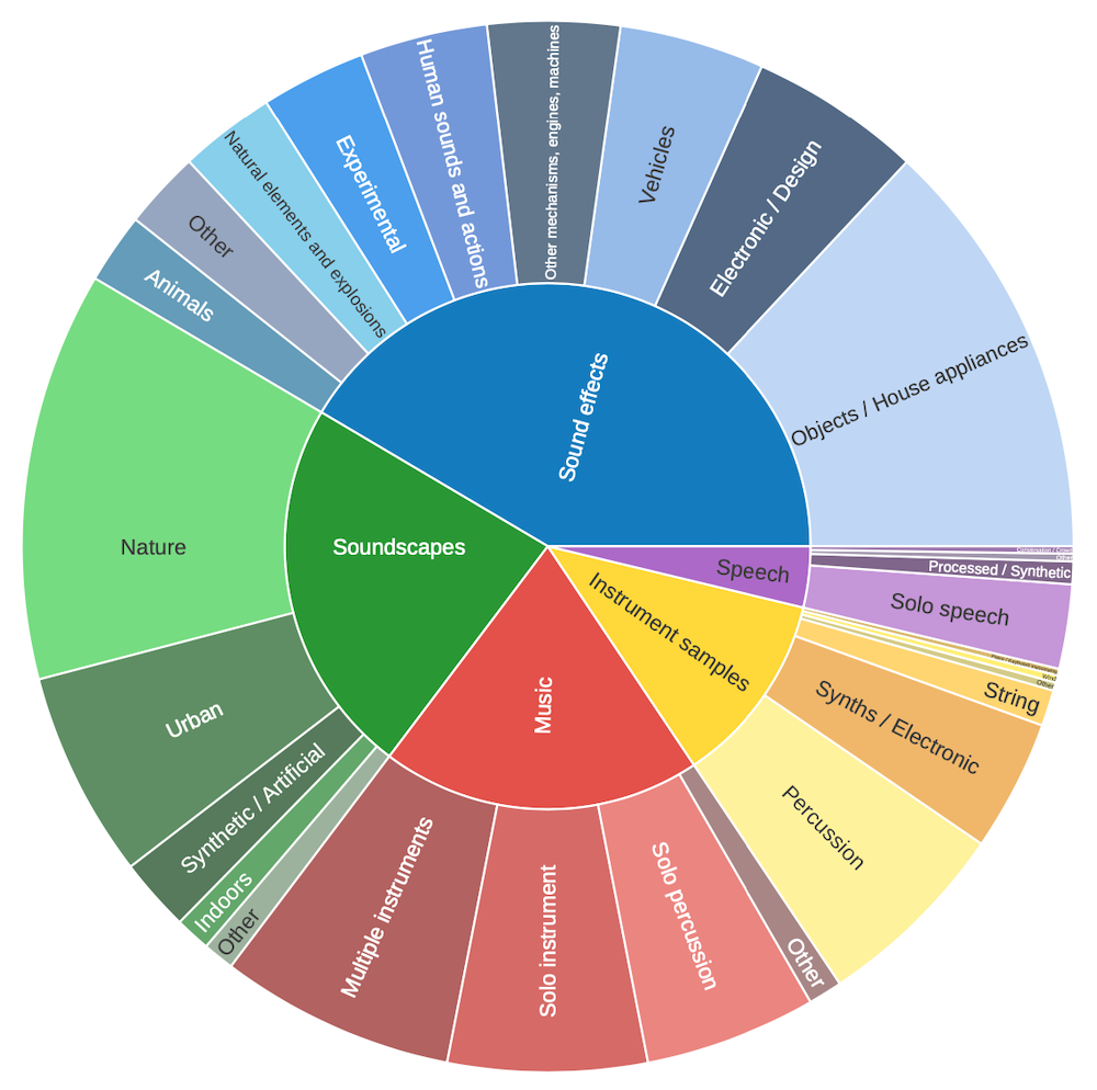 There’s more a lot more to discover by looking at how users navigate the taxonomy (remember that in the search page, you’ll find filters for the BST categories!). When searching, each top-level category has an Other subcategory which is used in approximately 7% of sound uploads, and captures uploads where contributors aren’t quite sure which category to choose. That means that we might need to provide some more help to users when choosing their categories. All in all, it’s clear that Freesound is incredibly heterogeneous, and there are tons of sonic gold to discover across every type of sound. There’s a lot more to learn about the distribution of sounds in Freesound, but for now: happy uploading, and don’t forget to give a little thought to where your sounds belong and discover all corners of Freesound 🙂
